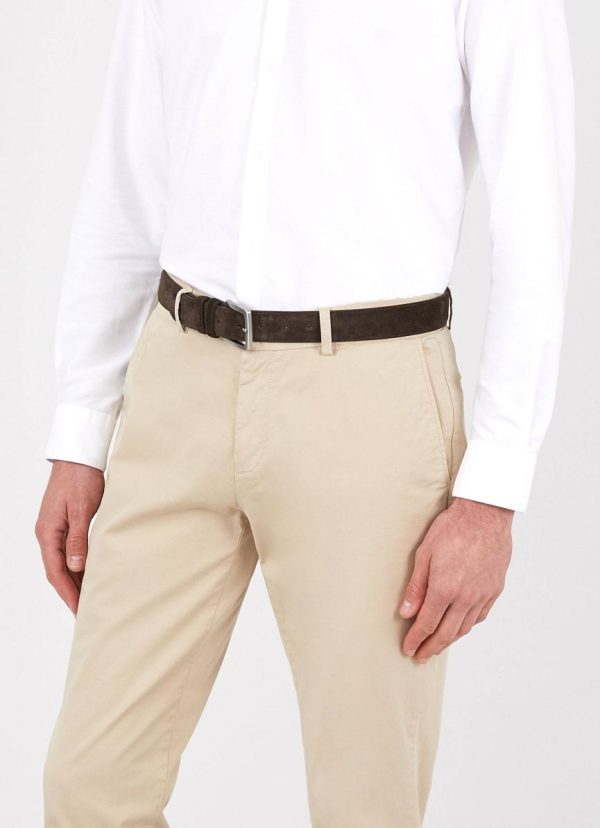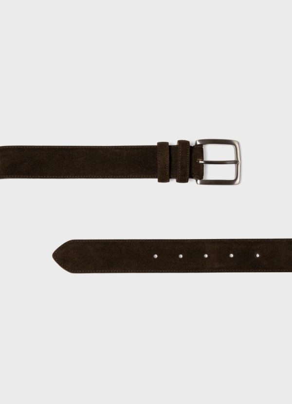 A luxuriously soft suede belt, lightly padded with leather backing. The brass buckle has a chrome coloured finish. A classic belt made for Sunspel in Rutland, Leicestershire, England.