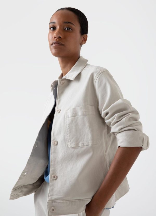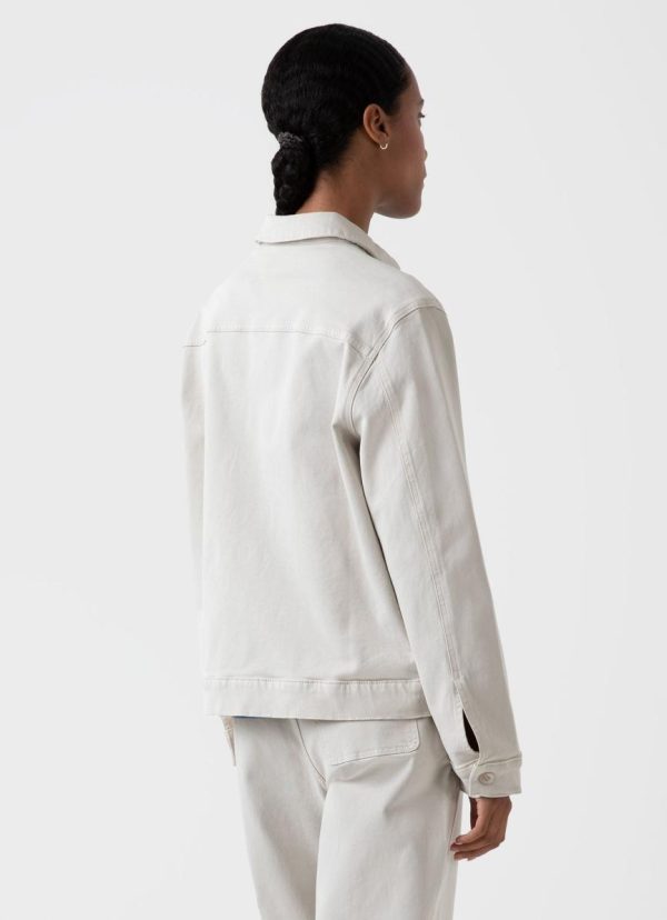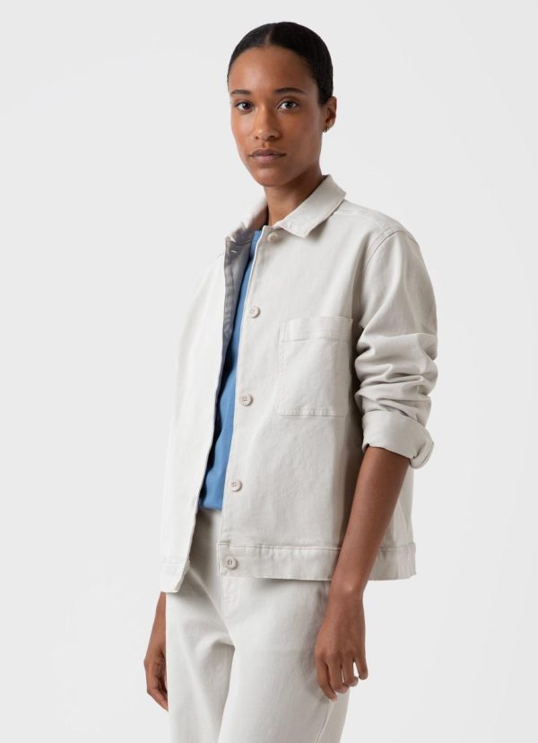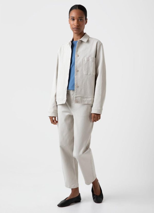 This chore jacket is made from French cotton drill that has been garment dyed to give a broken in feel. A boxy cut, with a neat collar and buttons. A good layering piece that works well with a T-shirt or knit. This is an easy workwear style with matching trousers.