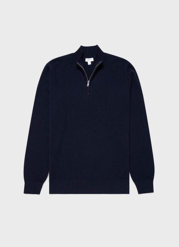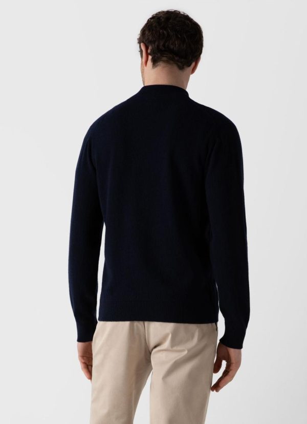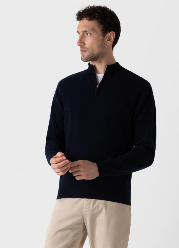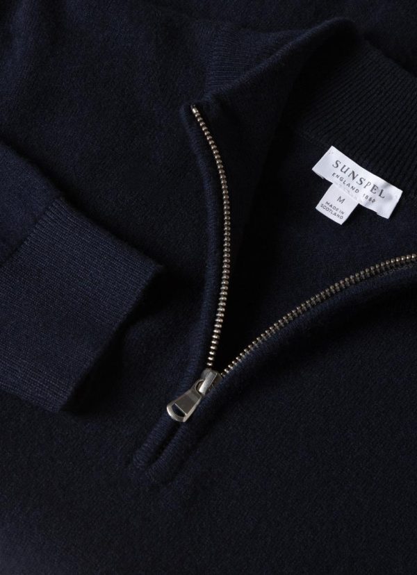 An easy contemporary half-zip jumper with a ribbed funnel neck, made in Scotland using Scottish spun cashmere. The cashmere is ethically sourced from nomadic herding communities by one of Scotland’s oldest spinners, Todd and Duncan. The wool is spun in Scotland and then knitted at one of Scotland’s oldest specialist knitters.