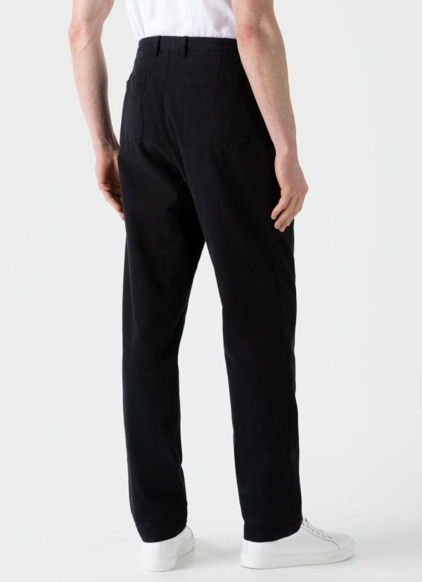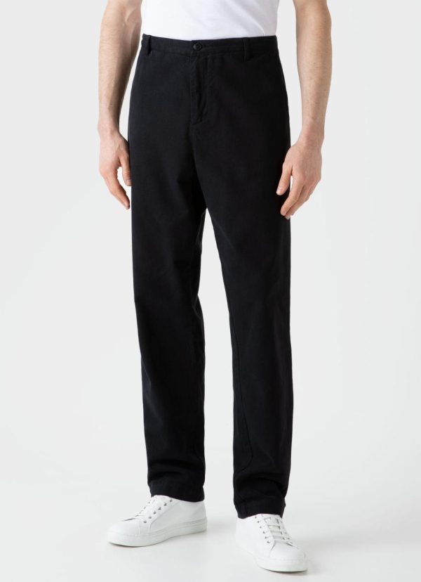 A wide leg heavy twill chore trouser made by French mill Velcorex with brushed cotton for extra softness. With a flat front it has a loose fit and a relaxed, easy feel. Pair with the matching chore jacket for the ultimate set.