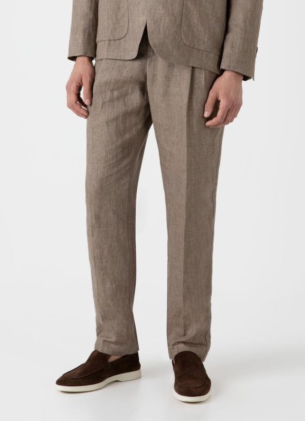 A smart linen trouser with a regular cut and single pleat front. Featuring a tailored waistband, slanted side pockets with a single rear welt pocket and horn buttons. Made in a lightweight 100% linen sourced from an Italian mill.