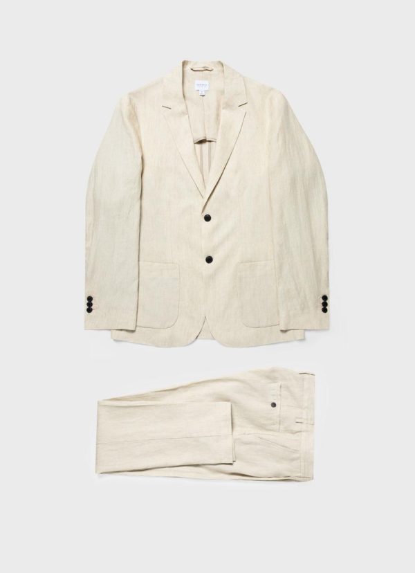 A summer suit with an easy contemporary feel, made in a lightweight linen sourced from an Italian mill. The jacket is unstructured with a regular fit, two horn buttons, two side pockets and an inside welt pocket. The trouser has a regular cut and single pleat front with a tailored waistband.