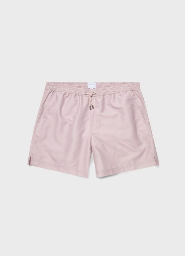 Drawstring swim shorts with a mid length leg. The shorts are manufactured using an upcycled marine plastic from Seaqual, made from waste plastic recovered from the oceans. Available in a range of solid tones and prints.