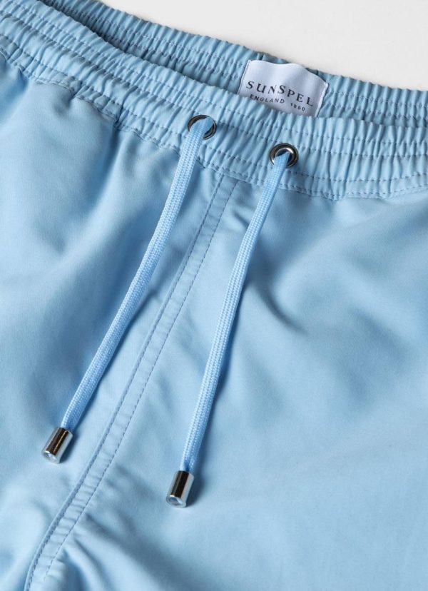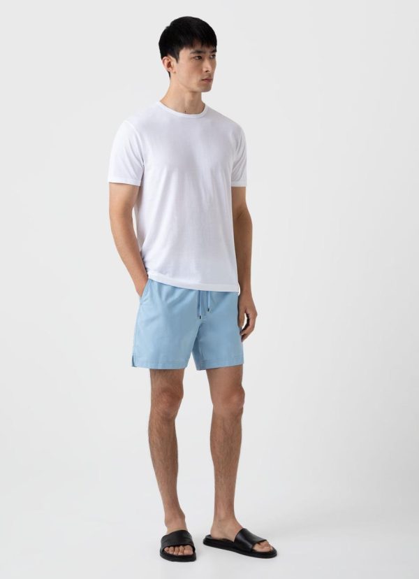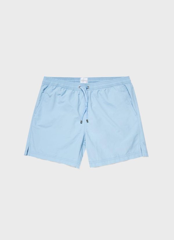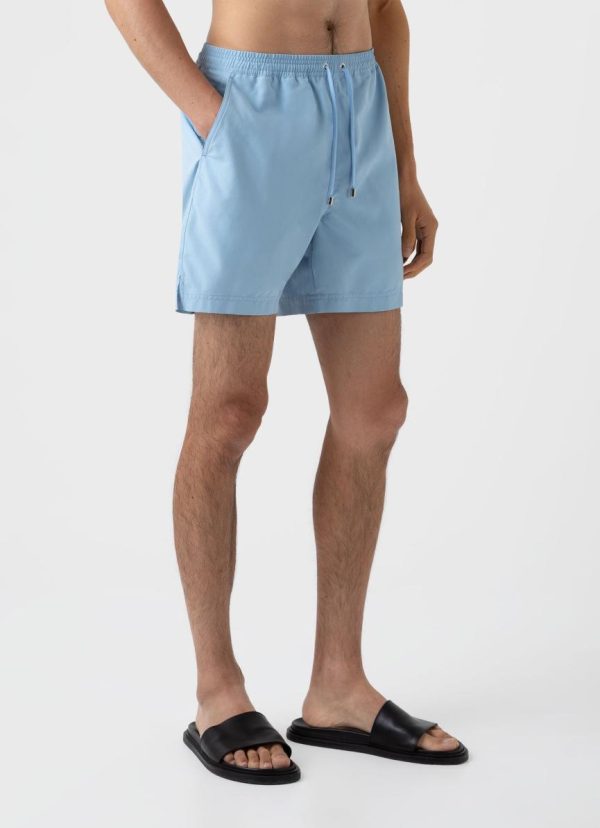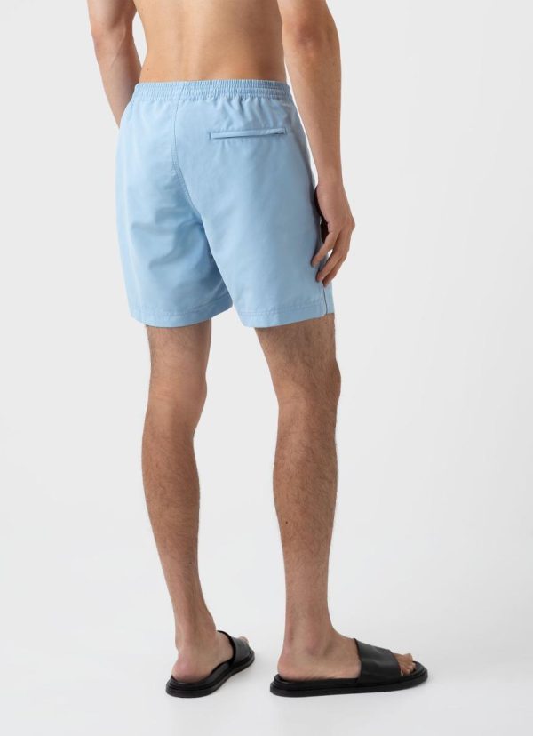 Drawstring swim shorts with a mid length leg. The shorts are manufactured using an upcycled marine plastic from Seaqual, made from waste plastic recovered from the oceans. Available in a range of solid tones and prints.