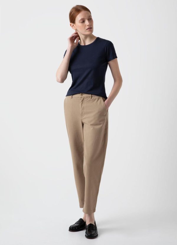 The Sunspel Classic T-shirt is handcrafted in our Long Eaton factory. It’s made with our signature jersey fabric which is exceptionally soft and smooth against the skin and we can trace the Supima cotton to the Californian farm of origin. It has an easy, feminine feel, with perfectly proportioned sleeves, a clean, body-skimming fit and a crew neckline. It’s cut to sit just above the waist for ease of movement. This versatile long-lasting piece will be the foundation of your everyday wardrobe for many years to come.